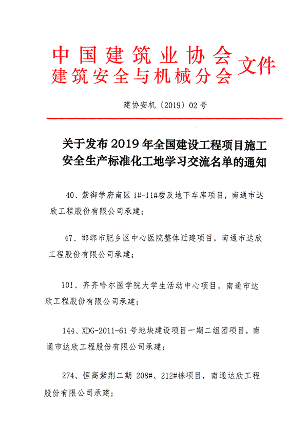 近日,從中國建筑業(yè)協(xié)會建筑安全分會傳來喜訊,達欣集團五項工程同時獲得國家建筑安全文明施工領(lǐng)域最高獎項“全國建設(shè)工程項目施工安全生產(chǎn)標準化工地”,再次刷新了公司安全創(chuàng)優(yōu)新記錄。