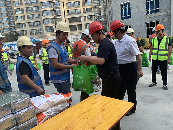 市長于立忠一行為大家送來了毛巾、防暑降溫飲品等消暑物品,感謝大家為建造和諧社會、美好家園在高溫酷暑中依然堅守,為祖國、為家鄉(xiāng)做貢獻(xiàn),同時也希望大家立足本職工作,繼續(xù)發(fā)揚(yáng)特別能吃苦、特別能戰(zhàn)斗的主力軍作風(fēng),展現(xiàn)新時期達(dá)欣鐵軍隊伍特有的風(fēng)采,并反復(fù)叮囑大家一定要安全施工,合理安排作息時間,勞逸結(jié)合,保重身體,做好防暑降溫措施。
